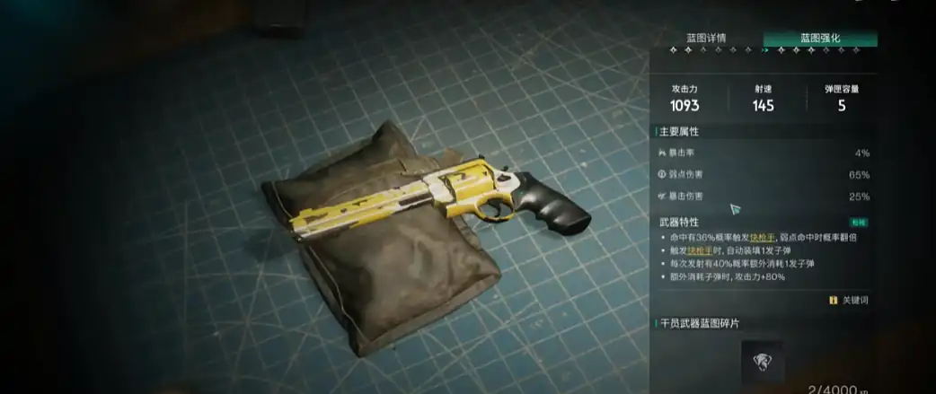 这是一把四星的手枪,虽然星级并不是最高的,但是这把武器基本是前期就能顺利拿下的,整体的参数看起来似乎和普通的手枪没有太大的区别。但是它有一个很大的优势,就是使用该武器时,有一定的几率触发快枪手,在快枪手状态下,角色的攻击速度得到增强,还能一次性将所有的子弹都装填上;其次就是它的第二个特性,攻击时有一定的几率增加1枚子弹的消耗,但是能大幅度提升本次造成的伤害,在弹药充足的情况下,该武器的输出力度是非常高的。