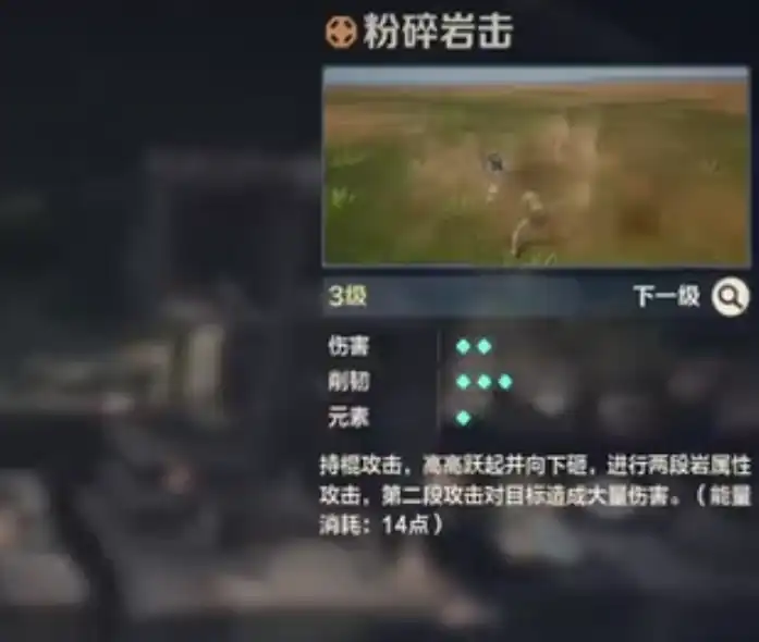 猎人棍的平A伤害不高,优势就是削韧能力,所以我们一定要运用好频繁的让对手在战斗中气绝,随后执行处决攻击,它的战技非常强力,比方说粉碎岩击会持棍高高跃起后下砸,形成2段的岩属性输出值。
