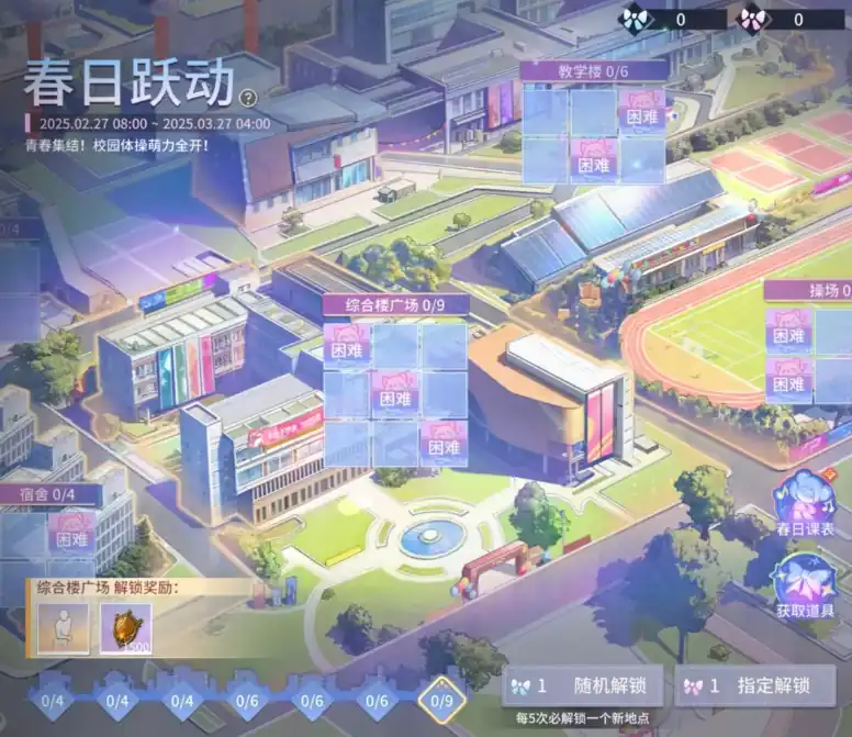 首先是“春日跃动”活动,鼓励玩家探索校园,解锁七大区域获取奖励,包括超萌外观、社交动作【彩虹节拍】、【夸夸舞】,以及展示背景与底座。每日签到和任务可收集道具,用于解锁地点和收集校园打卡照片。