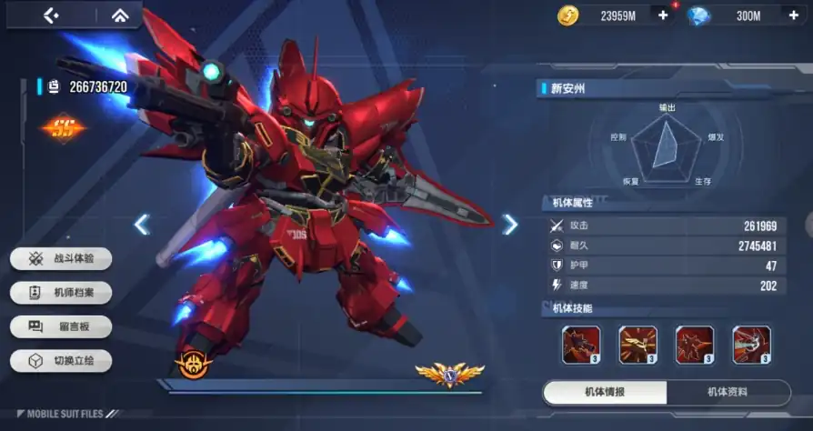 新安洲的核心搭载的新型精神骨架采用纳米级量子纠缠技术,能够将驾驶员的神经脉冲转化为战场预判数据,在被新吉翁军部队夺取后,指挥官伏朗托通过自身能力将该机改造成具有战略压制力的机动战士,技能体系中火箭炮急袭 采用粒子束与实弹融合技术,其复合式发射器可在0.4秒内完成GN火箭炮与光束步枪的模式切换,对最远3个目标实施交叉火力打击。