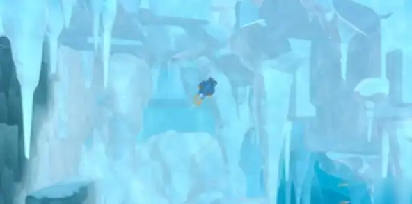 从冰河区域向右上方前进,玩家将进入冰川洞窟,冰川洞窟是一个充满未知的区域,内部结构复杂,道路蜿蜒曲折。玩家需要小心前行,避免迷失方向。洞窟中的环境设计极具沉浸感,冰柱、冰墙和微弱的光线共同营造出一种神秘而紧张的氛围。