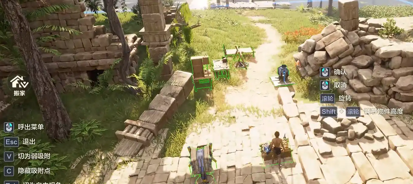 这么选的原因是这种家园比较容易阻挡周围玛卡的侵袭,更有安全感。找到一个合适的地方后,还是按B键打开建造模式,点左下角搬迁,需要稍微调整一下布局,只要不显示红色区域就说明可以放置了。
