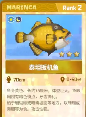 想要抓捕泰坦扳机鱼需要了解所在的位置,主要是在0~50米的水深位置,常见于珊瑚礁或暗礁坡面等地。这种鱼的体型比较大,而且还会有较大的攻击性。建议在捕捉时可以带消音飞镖或者是麻醉枪。