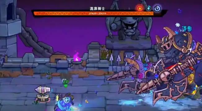 游戏中玩家并没有找到失落城堡2混沌骑士,不过却找到了流浪骑士。流浪骑士是一个伤害数值比较高的boss。在开局之后就会直接冲着玩家攻击武器,在下垂之后还会造成范围性的伤害,如果没有躲开,那肯定就会被打败。