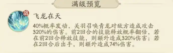 关羽的战斗技能名为飞龙在天,这是一个非常高爆发的技能,在战斗中,关羽有40%的几率发动该技能,召唤青龙对敌方造成320%攻击力的伤害。这一技能的威力在前期尤为显著,因为前两回合关羽的技能释放概率翻倍至80%,并且如果成功释放,将会额外增加320%的伤害加成,总伤害可以达到640%,然而,两回合之后关羽的技能威力会大幅下降,只能造成74%的伤害。