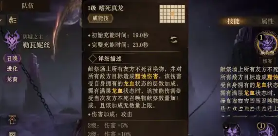 而勒瓦妮丝的终极技能嗜死真龙(威能技),则是她爆发能力的巅峰展现。技能通过献祭场上所有友方不死召唤物,对全体敌方目标造成360%攻击力的黯蚀伤害。每层龙血状态将进一步提升该技能伤害7%,若处于满层龙血状态时,每献祭一个友方召唤物,伤害还会额外提升5%,且无数量上限。这一技能机制让她在召唤物较多的情况下,能够瞬间引爆战场,对敌方造成毁灭性打击这一技能的设计也让玩家在召唤物的运用上需要更加精准的策略规划,以最大化技能的爆发能力。