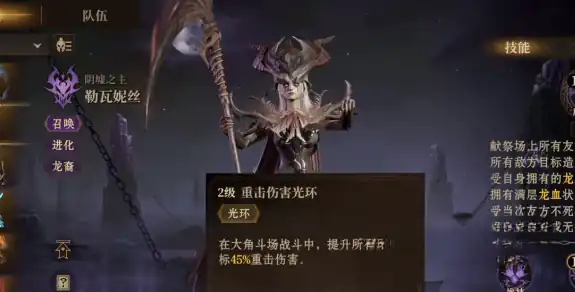 本期带来的是龙息神寂勒瓦妮丝技能介绍,龙息神寂中阴墟之主勒瓦妮丝以其极具压迫感的技能机制和鲜明的角色定位,成为战场上不可忽视的存在。作为一位掌控亡者与暗能量的强大角色,她的技能体系围绕“龙血”状态展开,兼具高爆发群体伤害与持续增益能力,尤其在大角斗场等持续战斗场景中表现尤为突出。