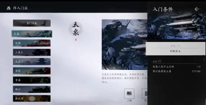 加入天泉门派的过程中,另一个重要条件是玩家需要积累60点侠义值,并集齐3件“不义之财”。第一件可通过上述任务获得,其余两件需要玩家在野外探索或完成特定支线任务获取。侠义值的积累方式丰富多样,可以通过完成各类侠义任务或帮助NPC解决问题来提升。这一设计鼓励玩家在游戏世界中积极参与探索与互动,体验更多内容的同时为加入天泉做好准备。