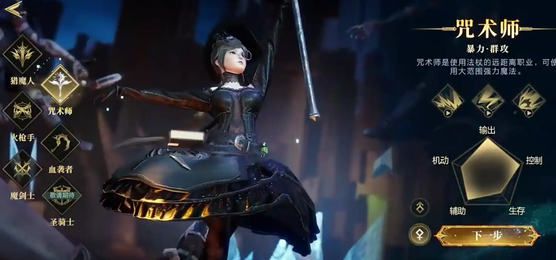 咒术师会手持法杖,在超远距离进行毁灭性打击和控制,如果想要集控制与输出为一体,咒术师就是最适合大家的,他的第一个技能可以召唤落雷形成范围输出值,他的第二个会召唤一个奥术旋涡持续向前推进,对旋涡附近的敌人形成输出值,他的第三个会朝着前方释放出冰封之路,对敌人形成冰冻效果。