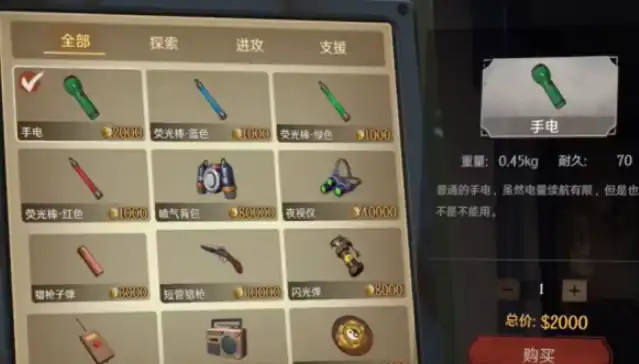 手电筒是一种可以在商店购买得到,也可以在地图中探索获得的道具,它在照明中突然不亮,其实是因为耐久度的原因,而这个耐久度会有便宜的和贵的区分,商店中大家能看到夜视仪、荧光棒、手电筒和专业手电筒等等照明用具。