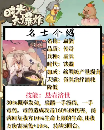 今天小编给大家带来时光大爆炸扁鹊介绍,因为在游戏中扁鹊是一位治疗角色,其亮点在于其强大的治疗能力和与其他角色的良好搭配,但是很多人对于这个角色的了解还不够透彻,因此为了帮助大家获得更充分的了解,今天小编将会为大家进行详细的介绍,让大家更好地认识这个角色,因此感兴趣的玩家们抓紧来看看吧!