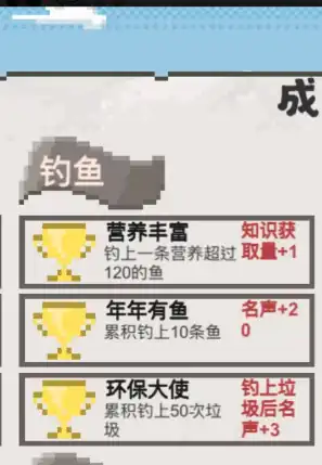 ②钓鱼成就。其中“营养丰富”指的是钓到一条营养值超过120的鱼,完成此成就将为大家带来额外的知识点,具体表现为知识获取量增加1个单位。“年年有鱼”是指累计钓到10条鱼,实现此成就将使大家的声誉值增加20点,有助于提升社区中的声望和认可度。“环保大使”是指累计钓到50次垃圾,完成此成就后声誉值将增加3点。