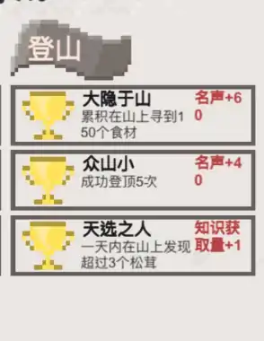 ③登山成就。其中“大隐于山”指的是在山上找到150个食材,完成此成就将使声誉值增加60点。“众山小”是指成功登顶5次,实现此成就将使声誉值增加40点。“天选之人”是指在一天内在山上发现超过3个松茸,完成此成就将使知识获取量增加1点。
