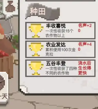 ④种田成就。其中“丰收喜悦”指的是一次性收获15个以上的农作物,完成此成就将使声誉值增加20点。“农业发达”是指累计使用100次金克拉,实现此成就将使声誉值增加40点。“五谷丰登”是指一次性收获四种不同的农作物,其中经过浇水后生长得更快。