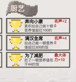 ⑤厨艺成就。其中“奔向小康”意味着累计为自己准备十顿营养值超过100的餐食,达成此成就将使声誉值增加20点。“满汉全席”是指为自己制作一顿营养值超过300的饭,完成此成就声誉值将增加4点。“为了减肥”是指吃了一顿营养值低于44的饭,完成此成就将使最大体力值增加10点。