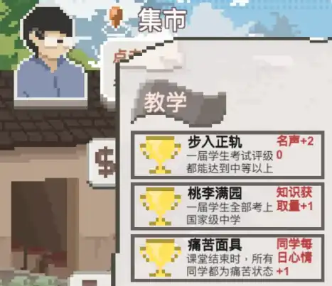 ①教学成就。其中“步入正轨”意味着一届学生在考试中评级均达到中等以上水平,实现这一目标将使大家的声誉提升20点。“桃李满园”指的是所有学生均被国家级中学录取,完成此成就将增加大家的知识获取量1点。“痛苦面具”描述的是课堂结束时,所有学生均处于积极状态,实现此成就将使学生每日心情值提升1点。
