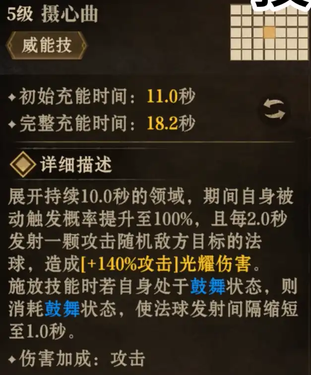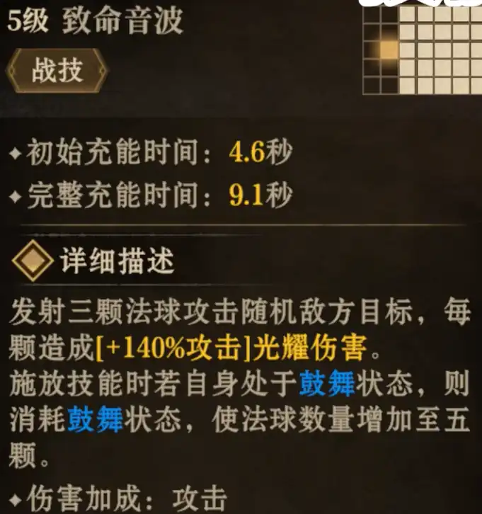 ③战技:致命音波,此技能使阿尔顿发射三颗法球攻击随机敌方目标,每颗造成+140%攻击的光耀伤害。若自身处于鼓舞状态,则消耗鼓舞状态,使法球数量增加至五颗。这是阿尔顿的主要输出手段之一,能在战斗中造成可观的伤害。④威能技:摄心曲,此技能使阿尔顿展开持续10秒的领域,在此期间,自身被动触发概率提升至100%,且每2秒发射一颗攻击随机敌方目标的法球,造成+140%攻击的光耀伤害。若自身处于鼓舞状态,则消耗鼓舞状态。这一技能不仅提升了阿尔顿的输出能力,还通过提升被动触发概率,增加了队伍整体的战斗效能。