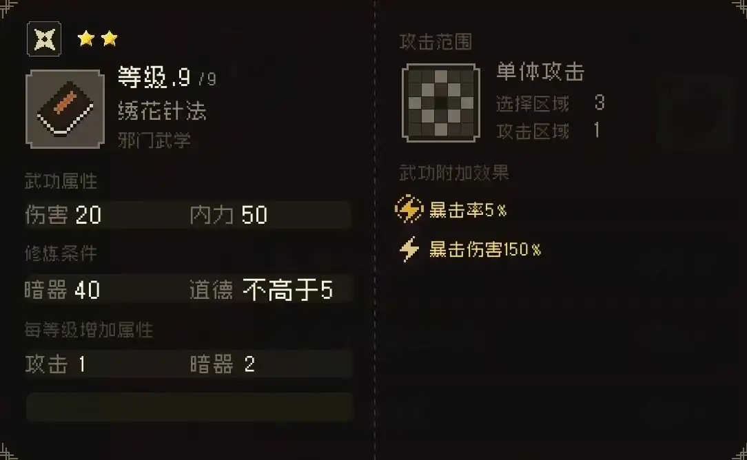 第5个透骨钻心钉,来到临安城之后,找到老乞丐,在他那里可以直接买到。第6个绣花针法,获取比较复杂,在当江夏渡口触发上官楠剧情,之后进入小树林中与鬼手对话,这时要选择第2个对话选项,完成战斗后,如果道德大于等于5,就能在酒馆门口出发一段剧情,然后获得。第7个阴阳生死符,江夏渡口的老乞丐商店中花费1000块钱购买到,要求主角等级大于10级。