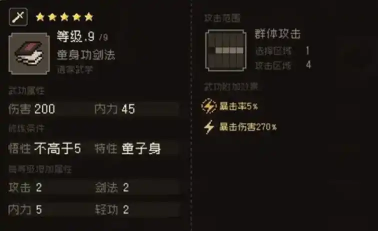 将童身功与浑行无穷正象天进行组合可获得特性,童身无忌白首太玄,具体的属性为攻击力提升10%,轻功属性提升10%,移动力加1,同时可以无视所有的debuff。将童子身与亢龙有悔进行组合,可获得见龙在渊飞龙在天,属性为拳掌伤害增加20点,攻击力提升10%,暴击率提升5%,在敌人身上携带内伤buff时,造成的伤害同时也会增加。