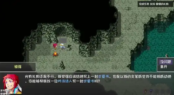 第三部分任务是求爱信,与彼得完成对话后则可以开启求外线这个支线任务,前往树心城的冒险者酒店寻找到吟游诗人,花五千块钱买到求爱信,再次回到彼得身边,与他进行对话可以获得护身符,之后前往落霜洞窟的隐藏区,朝着右边的门行走,就可以获得哥布林王国地图所需的相关道具。