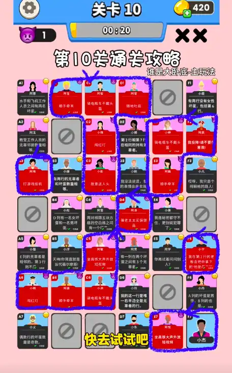 休闲益智类的小游戏成为了众人们打发休闲娱乐时光的重要单品之一,今天小编想分享的就是谁是大卧底?这款游戏听说不少小伙伴们卡在第十关,那么今天这篇谁是大卧底第10关攻略内容就分享给大家。小编将在下文当中为大家一一讲解每一次的分析过程,并且帮助更多初体验该游戏作品的玩家们可以快速通关。