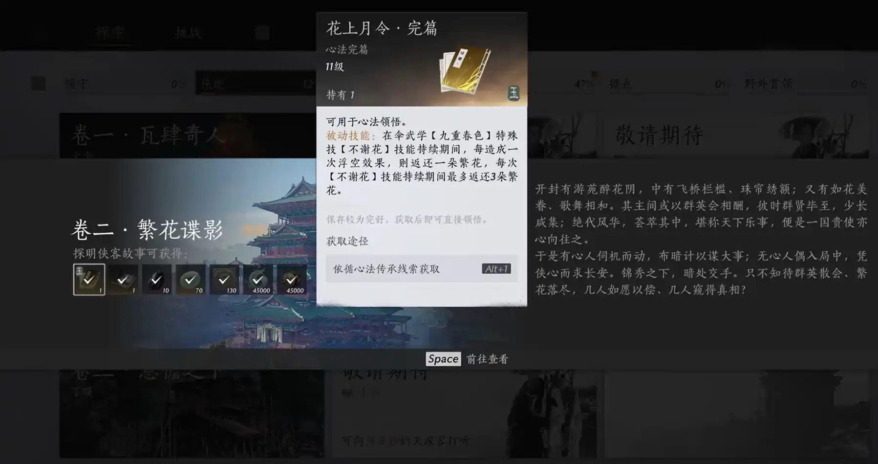 伞类武学九重春色必带的心法,能让玩家在浮空时触发返还繁花的效果。当人们完成卷二繁花谍影后,就能在任务奖励中把这门心法给拿到手。