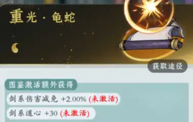 在伤害已经足够的情况下,必须要有一个防御能力的神通来帮助玩家承受伤害,小编这里选择的是重光龟蛇。该神通携带以后就会直接帮助剑修玩家增加百分之二的伤害减免效果,不仅如此重光神龟对于剑修还有额外的属性加成。所以在防御神通的选择上,重光神龟无疑是最好的选择。