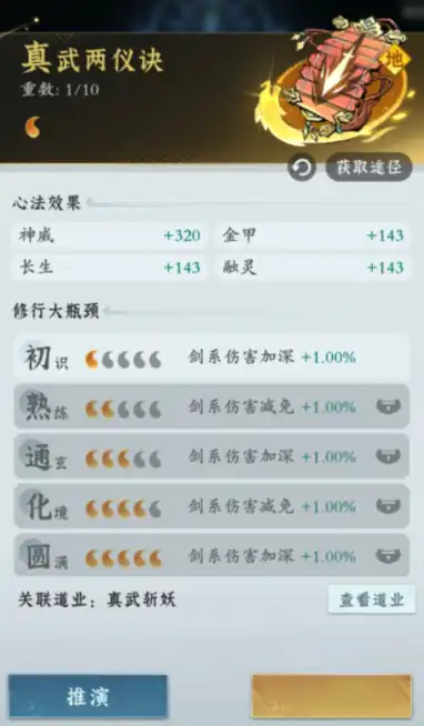 神通搭配完成以后,小伙伴们就需要考虑其它的事宜了。如果想要自己选择的神通能够发挥出更大的作用,那么心法也是一个十分重要的关键节点。小编在这里推荐真武两仪诀,它的作用是提高剑法所携带的威力,并且还拥有少量的防御属性。