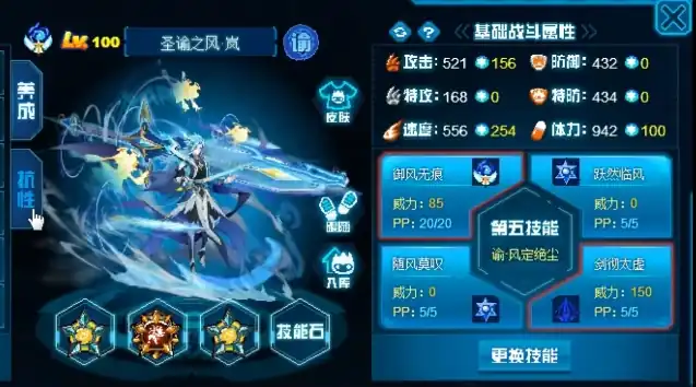 此外附加自身体力与速度总和20%的固定伤害,每次增加5%,最高30%,强化属性技能跃然临风,可以让自己全属性+1并且当自身不处于能力强化状态时强化效果翻倍,其次4回合内吸取对手最大体力的1/3,并且当自身体力低于1/2时吸取效果翻倍,最后下2回合自身所有技能先制+2,防御技能随风莫叹也具有多种强大效果,首先是4回合内免疫并反弹所有受到的异常状态,其次4回合内对手使用属性技能则将对手所有PP减少2点,这是一个相当不错的干扰效果。