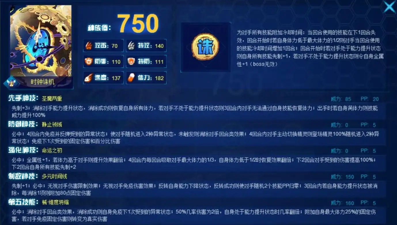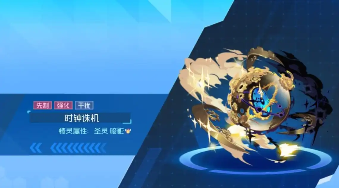 即使时钟下场对手冷却中的技能依旧会失效,回合开始前判定,本回合自身所有的技能都会享受到属性提升或者先制提升的效果,先手技能是圣魔两重,先制+3,它可以消除对手的能力提升状态,消除成功则恢复自身所有体力,对面没有提升增益的话则3回合内对手无法通过自身技能恢复体力,出手时若自身满体力,则技能威力提升100%。