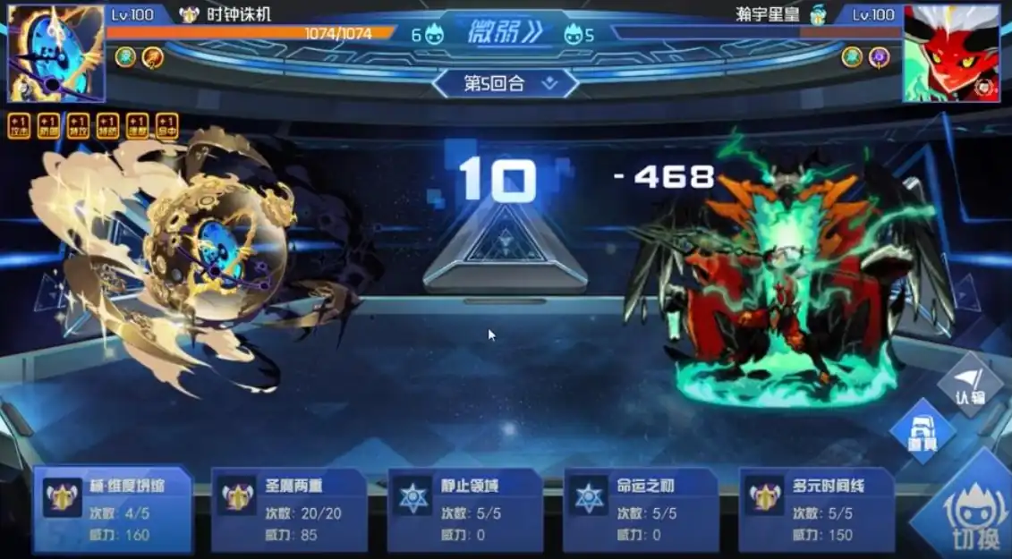 时钟诛机的强化属性包括命运之初,这个技能也是必中的,它可以提升全属性+1,如果体力高于对手,则提升效果翻倍,在4回合内,每回合可以吸取对手最大体力的1/3,当自身体力低于1/2时,恢复效果翻倍,在接下来的2个回合中,对手受到的伤害会提高100%,并且所有技能都会先制+2,时钟诛机的大招是多元时间线,这个技能先制+1且必中,它可以无视对手的伤害限制效果和免疫伤害效果。