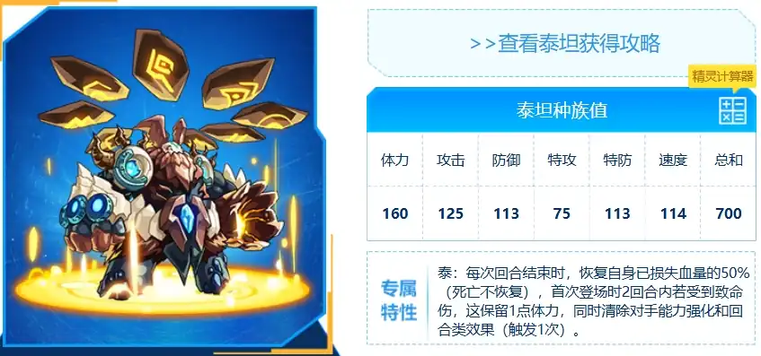 但是他的特性效果还是有一定的实力的,每这个效果就是在每次回合结束时,它能够恢复自身已损失血量的50%,不过若已死亡则不会恢复,并且首次登场时若在2回合内受到致命伤害,它会自动保留1点体力,同时还能清除对手的能力强化状态以及回合类效果,此特性触发机会仅有1次,这一特性让泰坦在战斗中拥有了极强的生存能力和应对突发状况的能力。