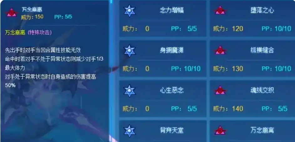 作为属性粉伤的代表技能,在小额补偿的条件下主要辅佐红伤,强化补偿回合粉伤补刀,万念崩离是非必中的核心技能,先出手时能让对手当回合属性技能无效,命中时若对手不处于异常状态,则会减少对手1/3最大体力,若对手处于异常状态,自身造成的伤害会提高50%,这个技能可以与魂印的束缚效果搭配使用,此时高速的优势就能得到充分开发,基本上只要有异常增伤效果,先手150摸中一下,高额红伤就会立刻显现出来。