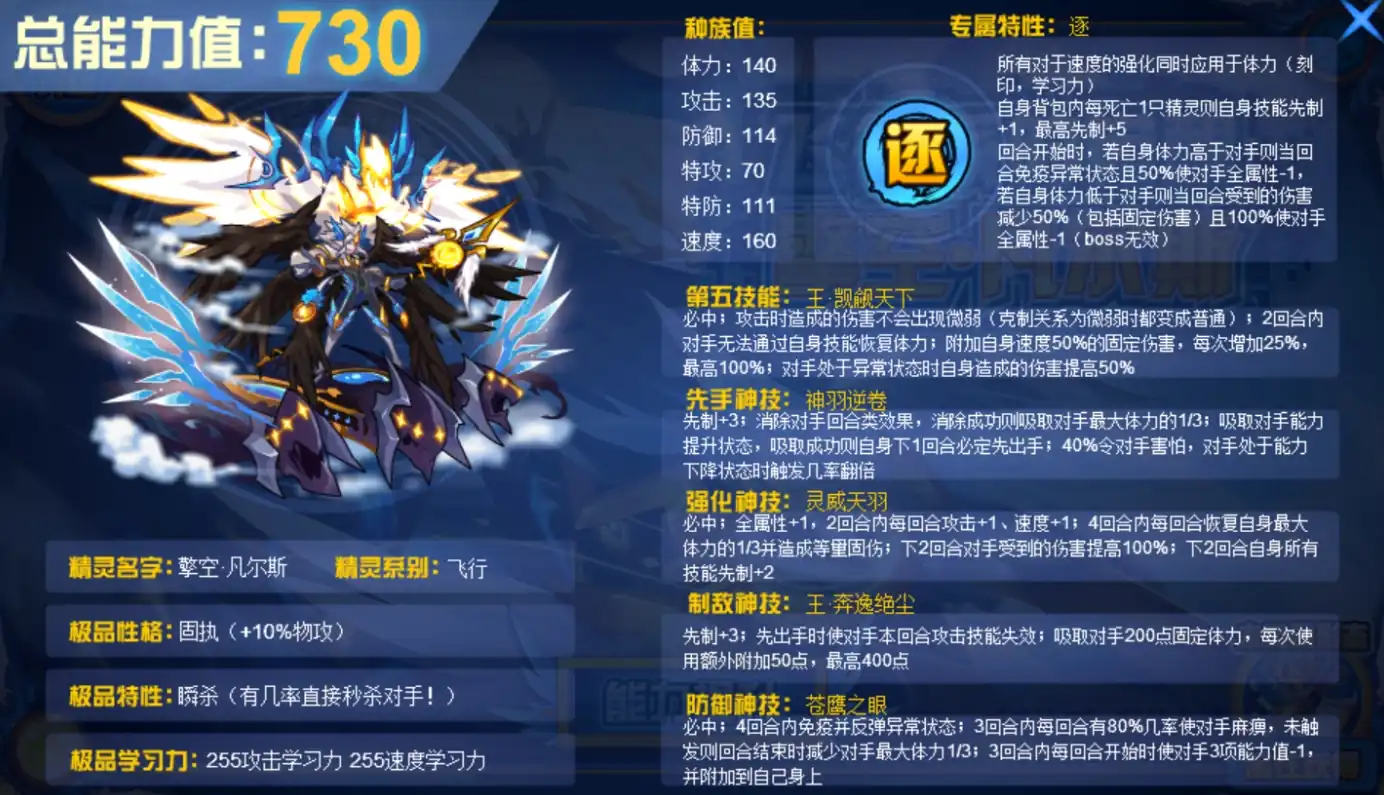 而当自身体力低于对手时,它则能在当回合减少50%所受到的伤害,包括固定伤害,并且100%使对手全属性-1,从技能方面来看,神羽逆卷是其一大杀器,该技能拥有先制+3 的效果,它可以消除对手的回合类效果,一旦消除成功,便能吸取对手最大体力的1/3,这种对敌方状态的干扰与自身血量的补充双重效果,同时该技能还能够吸取对手的能力提升状态,若吸取成功自身在下1回合必定先出手。
