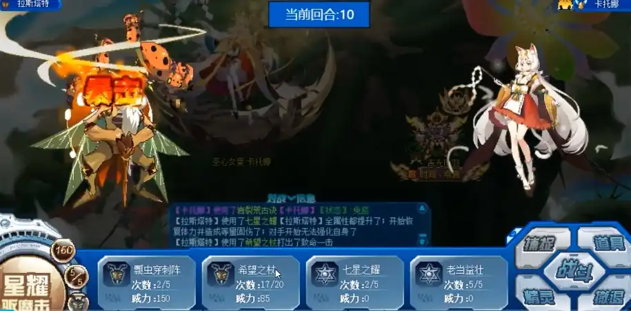 再借助绿火的特性,就可以在速度上快过boss,龙娘的配置在战斗中要努力打出 150 的伤害量,如果幸运地触发了翻倍伤害,那么就有很大的机会直接击杀卡托娜,要是没有触发翻倍,也不用担心,让两只备用的精灵使用先三补刀技能即可完成击杀,为了确保战斗的稳定性还可以适当压体,降低自身的血量,以提高触发一些特殊效果的概率。