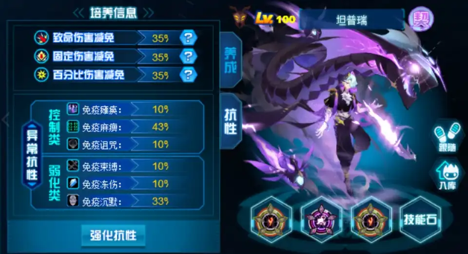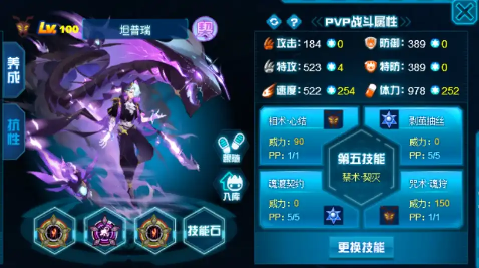 强化属性魂渡契约可以让全属性+1,若体力高于对手则提升效果翻倍,171的种族值很适合这一效果,可节制很少用到强化技能,其二4回合内每回合恢复1/3体力值,并造成等量的固定伤害,虽然是吃月亮的百分比伤害,魂印自带的吃月亮可在一定程度上弥补没有低体翻倍的不足,3回合内对手使用属性技能,则使用属性技能的下2回合无法使用攻击技能。