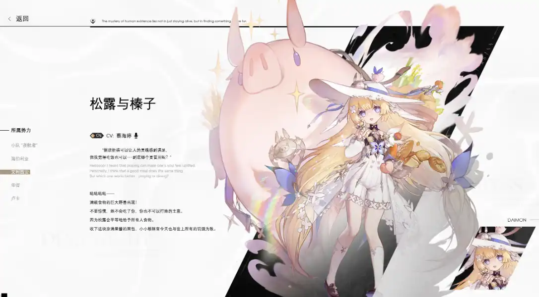 在人物设定中,松露与榛子也有着非常可爱的性格。可爱的金发少女骑着那只名叫榛子的小猪在满世界分发食物,但是你可千万不要主动打她手上食物的主意,因为她将会主动的把手上的面包赠送给你。