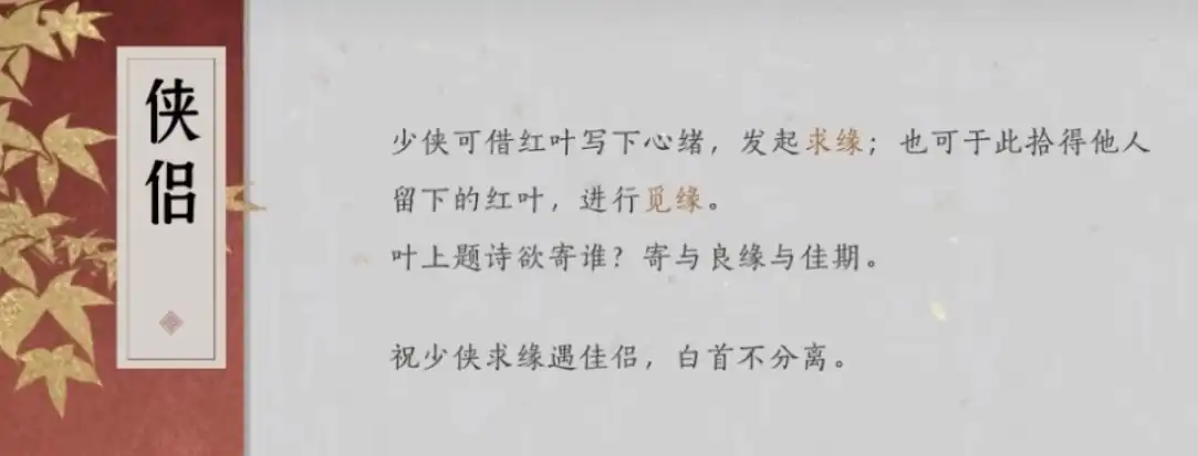 在寻找心仪对象的时候,系统会给玩家匹配合适的侠侣,这时候玩家就直接向对方发起求缘的请求。当然玩家想要结成侠侣的时候,也可以采取拾取红叶觅缘的方式,简单来说就是玩家在体验游戏的时候,可以拾取他人留下的红叶,这个红叶其实就隐藏着求缘的信息。