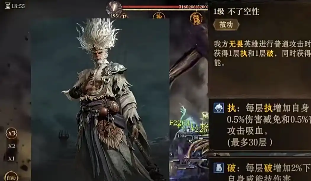 我方无畏英雄进行普通攻击时,自身冷得到1层执和1层破,还能获得1%的威能,猴哥对威能技能有着不俗的伤害和频率加成,还有着不错的生存能力,执和破可以看成是两个不同的buff,执每层可以增加0.5%的伤害减免和普通攻击吸血,最多能叠加30层,破可以增加2%的威能技伤害,可以叠加50层。