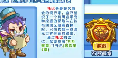 石系徽章:先传送到拉布朗矿山的入口,去拉布朗水晶宫门前,这里有一个矿工游戏,完成后就可以前往水晶宫的神秘领域。在这里,玩家需要挑战并战胜托比,才能收获石系徽章。记得利用地形和宠物技能,提高战斗胜率。