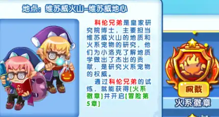 火系徽章:玩家需前往维苏威火山,完成这些任务后,这里有一个挑战,是击杀科伦兄弟,即可获得火系徽章。这个过程中,玩家需要巧妙利用地形和宠物技能,才能顺利通关。