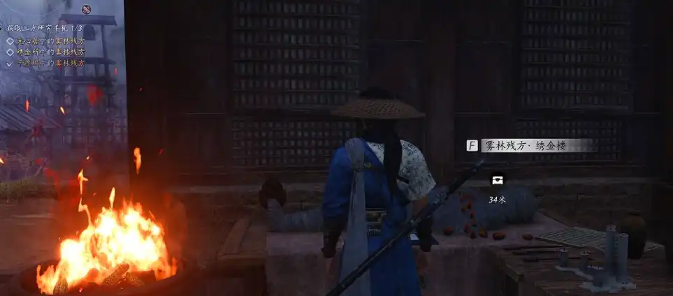 如图所示这个据点是位于“隐居林北”传送点的下方,玩家要消灭据点内的9个敌人才能达成攻占条件。无伤条件(仅限首通)需要从正面进入进去,用“悬壶望气”治疗谢休羽,这里需要悬壶的造诣达到1500以上。据点里面一共有4个宝箱,分别是是在囚笼旁、大水缸旁、瞭望台上、房屋内茶几旁。据点宝箱很好找,就在练功的木桩附近。而雾林残方则是位于房屋内火盆旁。