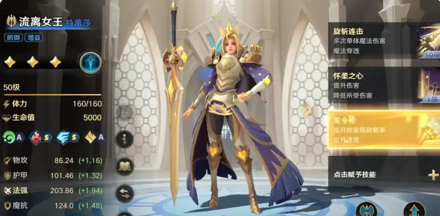 技能替换,在前期可以使用“士气高昂”与“守御过渡”。这个角色拥有别具一格的精美铠甲,佩戴了充满细节的披风和王冠,彰显着特蕾莎尊贵无比的气质。