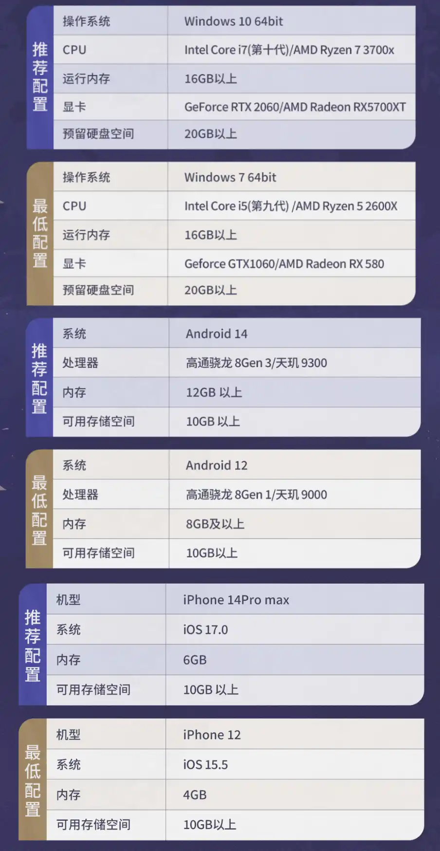 如图所示,这是游戏PC、安卓以及iOS三端的配置需求。挑其中比较重要的点和大家说,电脑端不管是低配还是推荐配置都需要至少16GB的运存,说明这个游戏在运行的时候会比较吃资源,尤其是随着游玩时间增长。