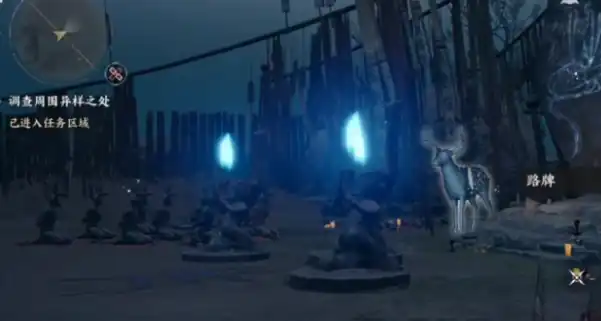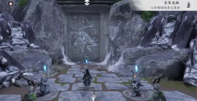 首先跟着指引抵达神秘巨像处,在这里模仿其他人先跪在地上,跪一会儿能看到一只发光的鹿,我们看着它消失后,使用听声辨位追踪它的方向,跟着痕迹沿着右边的小路一直走,会看到石门前有个躺下的人,获取他的遗言线索后,返回到石门外面,会看到这里有两个人跪在地上。