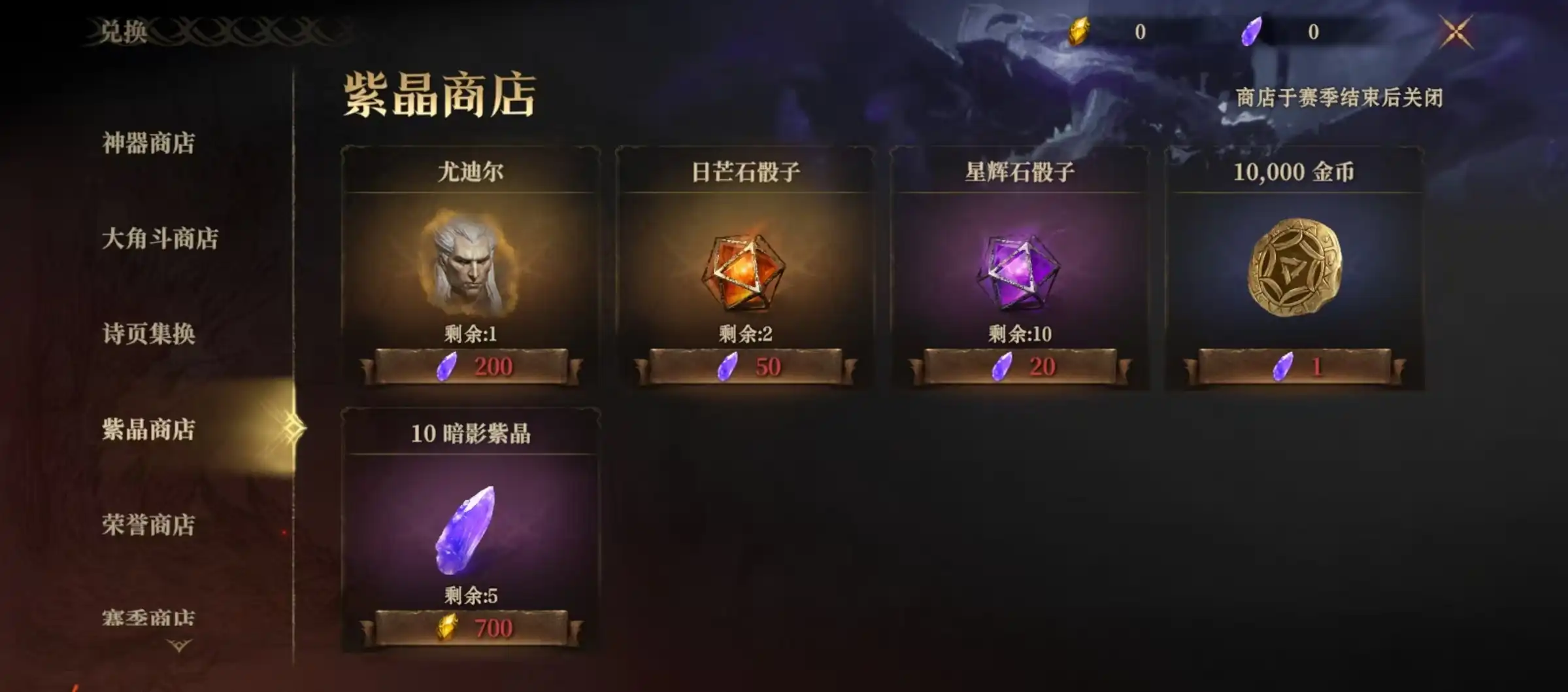 第2个是在紫晶商店中,紫晶商店消耗的是暗影紫晶,参与重铸帝国之勇,可以获取的道具。接下来是荣誉商店,荣誉商店兑换需要的道具是荣誉勋章,还有赛季商店,这里需要消耗的道具是纯净沙核,是由时杀回响转化来,可以在每个赛季的赛季商店中兑换奖励。除此之外,如果要想获得更多的日芒石骰子,还可以采用直接购买方式。花费龙髓石可以直接购买到日芒石骰子,具体价格是350枚龙髓石兑换一个,这一点也是需要大家在游戏里稍微进行氪金的地方,也是拉开玩家差距的重要方面。