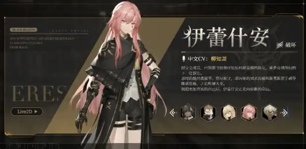 伊蕾什安基础攻击力为120,生命上限为1425,是楔文会的成员,同时也是前任巴别图书馆馆长的孙女。伊蕾什安的普攻分为三段,每段都能造成高伤害,特别是在第三段时,能释放出强大的重击,终结技能更是威力巨大,可以将最多四个敌人牵引到身边并造成高额的范围伤害。