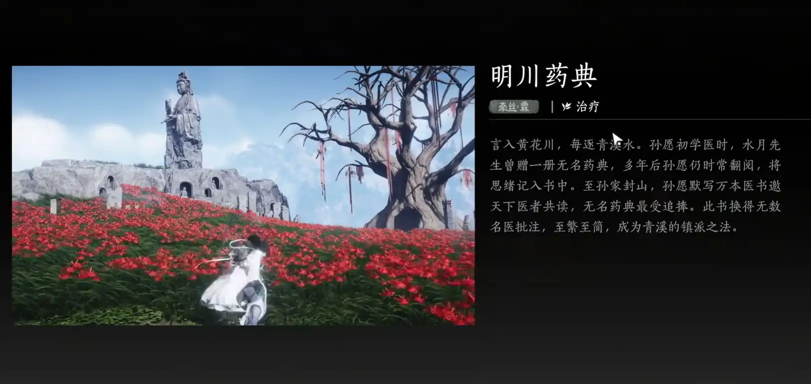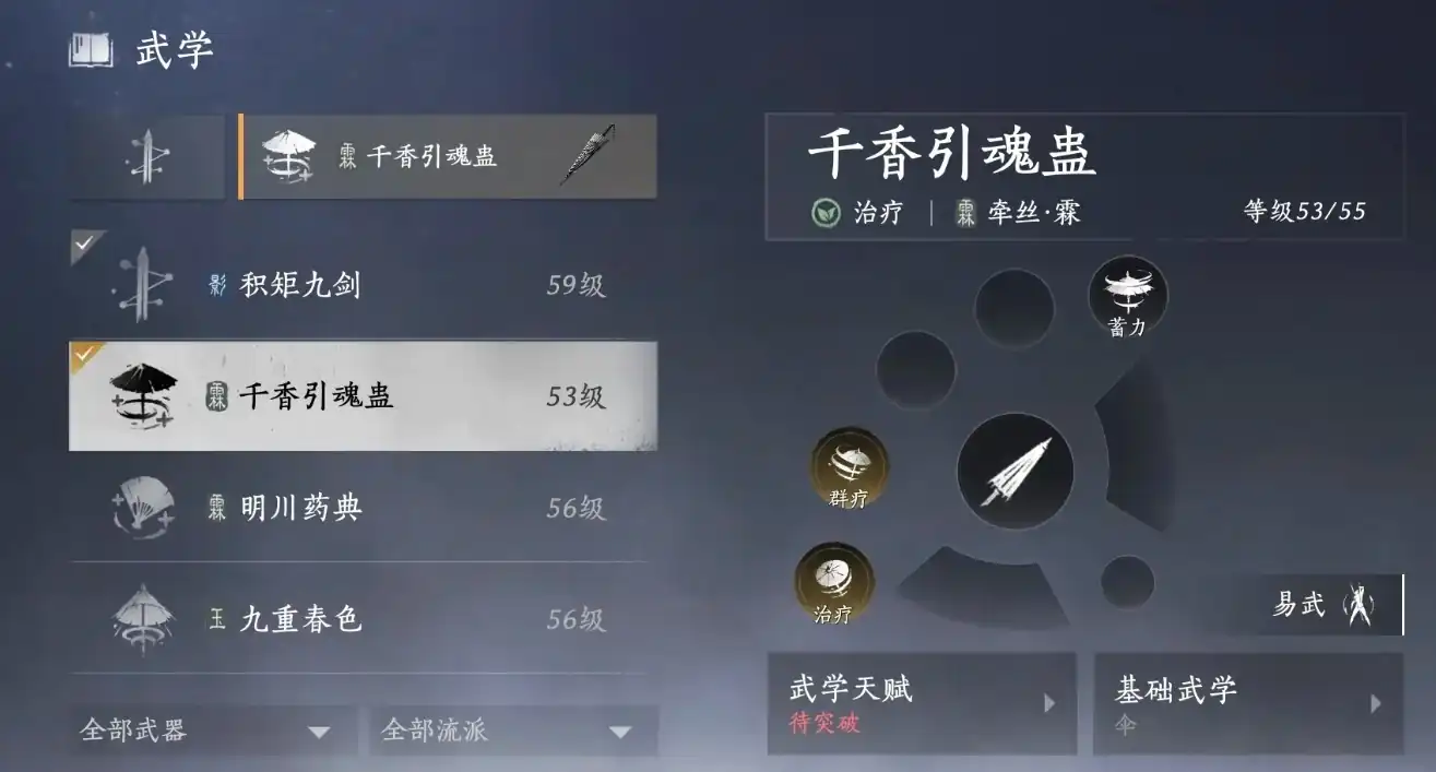 使用伞子才能搭配的武学,除明川药典外的加血武学,在开团打本时非常实用,玩家只需前往眠莹冢传送点,并探索该传送点对岸的城寨地下,便可进行偷师。