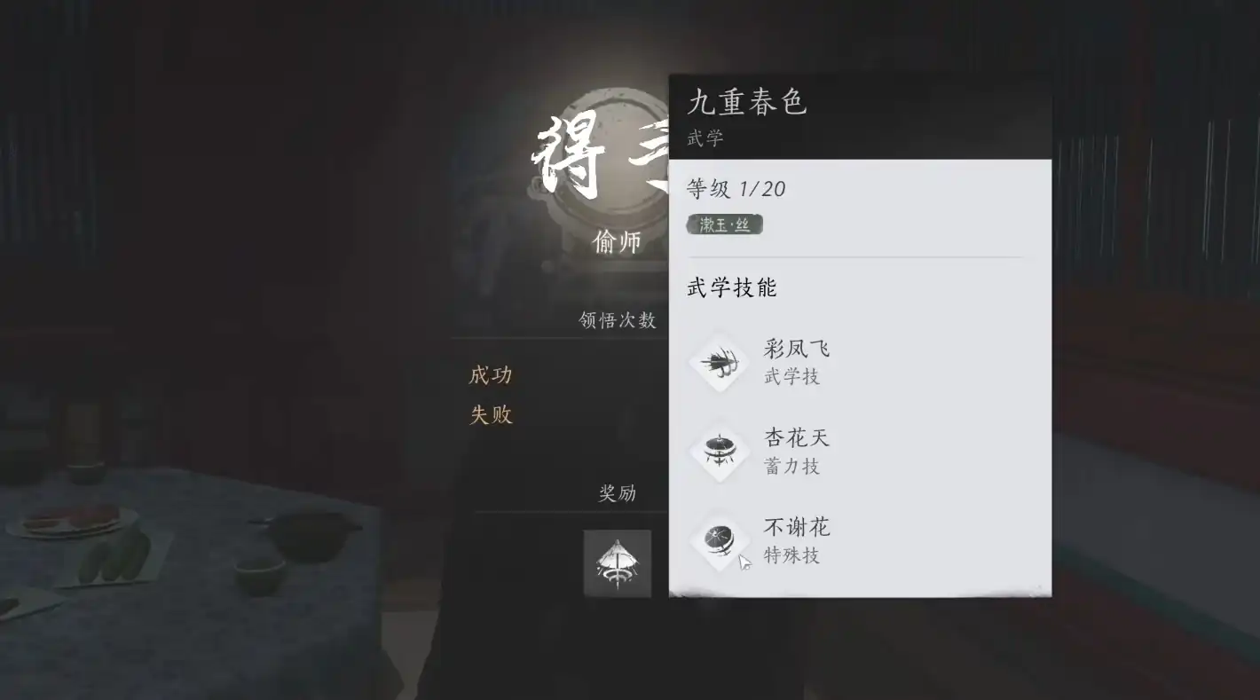 在进行探游任务荼蘼花时可顺道偷师的武学,也是醉花园门派的武学技能,普攻时能撑着伞在天上攻击,玩起来非常的有意思,而且本身的伤害也不低。