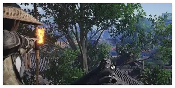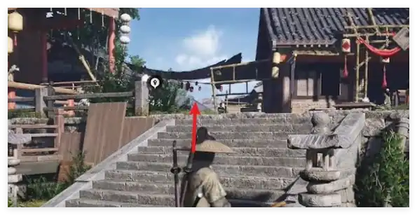 然后上房顶直接往正北的方向走,然后下来继续往西北方向走,在楼梯正上方,还会有一个可以收集,接着大家拿完之后就可以来到河边,在这里有一个房子的头顶,会有一个聊大家需要用弓箭将它打下,就可以继续进行收集,现在前往南方向的牌楼,在最高的亭子中,也会有一个鸟。